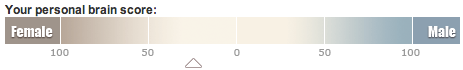 The scale below is an indication of where you fall in the male-female brain continuum. The results are based on the angles, spot the difference, 3D shapes and words tasks.